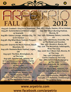 From Arpetrio.com“Arpetrio is a breath of fresh air for the live electronic scene. Their sound is one of a kind and draws from a broad range of influence while always staying true to themselves and their music. This dynamic three piece has been extensively touring the east coast from Boston to Miami and everything in between. Described by fans as “pushing the boundaries of electronica, jazz and jam music,” The band strives on a diverse sound that encapsulates the most popular and modern trends of electronic music.